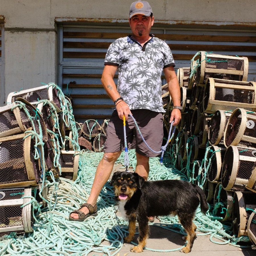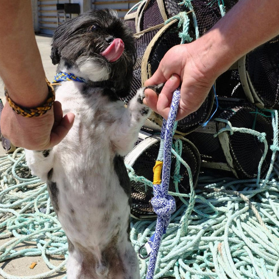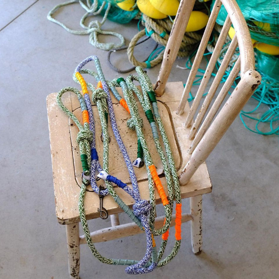 This 2m free-hand leash has been entirely handmade by Redeiras Artesás de Corme, a group of women who work with fishing nets in one of the most emblematic fishing ports in the northwest of Galicia, our region. The redeiras have worked with materials traditionally linked to fishing gear and produced in Spain.