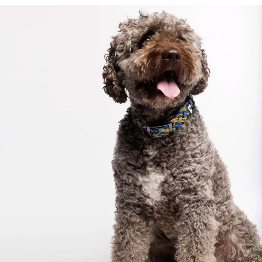 Polyester collar entirely handmade by Redeiras Artesás de Corme. Fully adjustable closure to fit the diameter of the dog's neck.