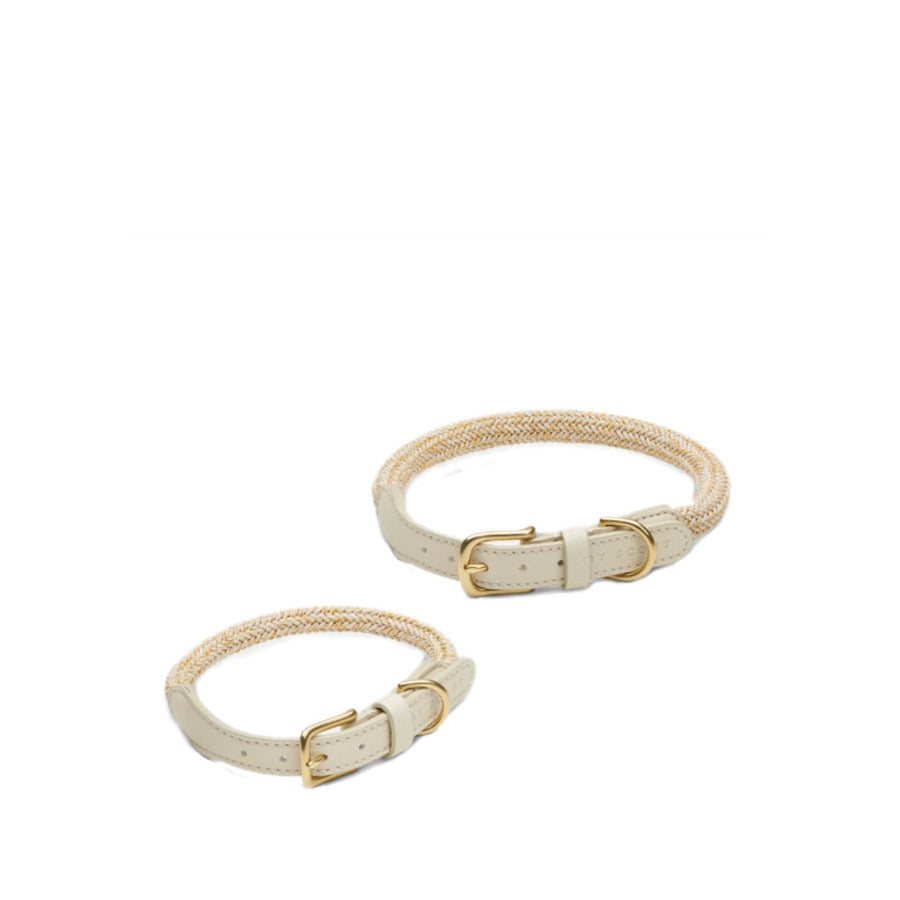 Elevate your four-legged friend's style with our Every rope collar that ensures the perfect everyday look. These collars feature organic cotton rope reinforced with a robust recycled polyester core, ensuring both durability and eco-friendliness, along with the added straps made from a partly bio-based vegan, versatile, and waterproof alternative to animal leather sourced from apple waste in Northern Italy's juice and jam industry. A soft and supple material that offers durability.