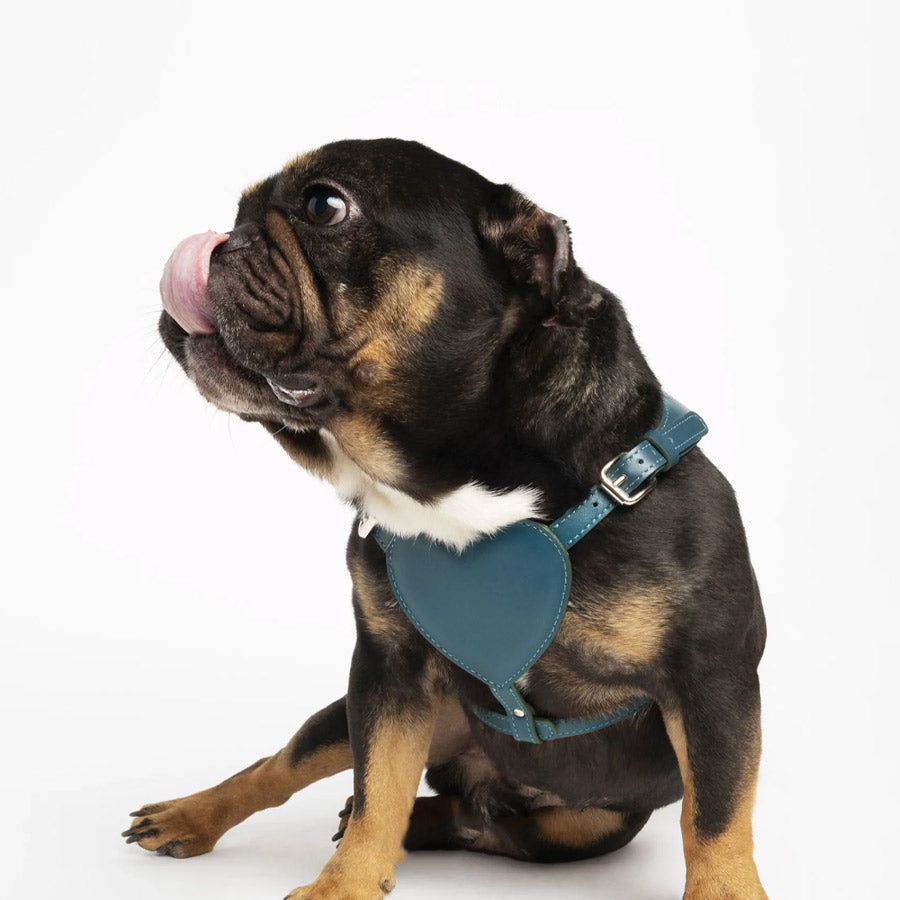 Heart-shaped padded leather harness, Adjustable via buckles on shoulders and chest.