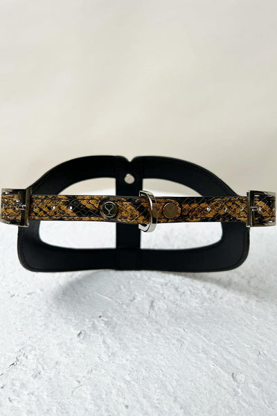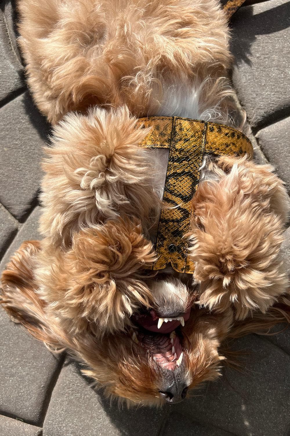 Elevate your dog's style with the Noah Dog Harness in Embossed Yellow & Black Leather from Shaya Pets. Handcrafted from luxurious, water- and scratch-resistant embossed leather, this luxury dog harness combines durability and elegance, perfect for everyday adventures. Each size offers six adjustable options for a secure and customizable fit tailored to your dog’s unique measurements. Animal friendly hardware ensures gentle comfort without pulling fur or irritating skin, making this harness a must-have addition to your pet accessories collection.
