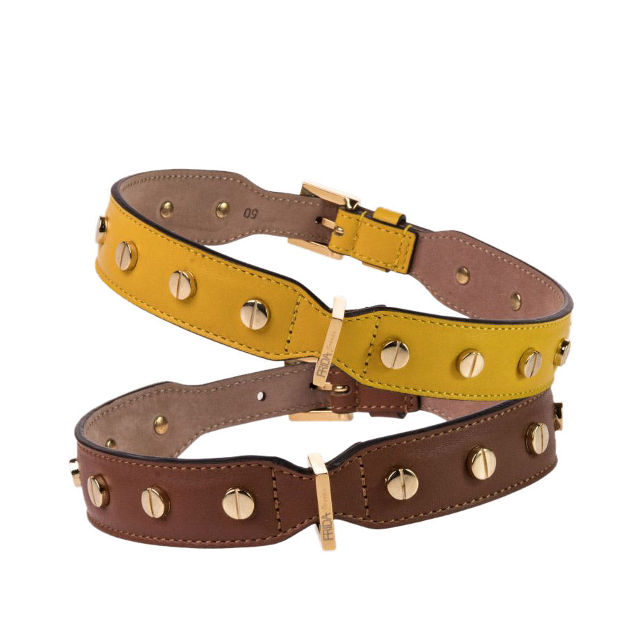 Collar in soft nappa calf leather enriched with elegant screw studs, buckle and ring in gold-plated brass. Nubuck lining to ensure maximum comfort. Handmade in Italy.